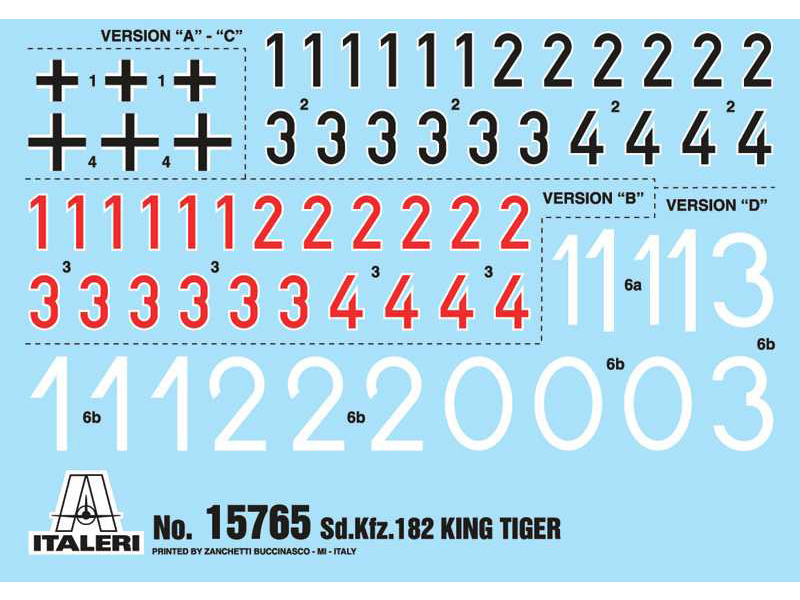 Plastikový model Italeri 15765 –tanku Sd. Kfr. 182 Tiger ll v měřítku 1:56 ke slepení. Obtížnost 2. Balení obsahuje SKVĚLÉ OBTISKY PRO 4 VERZE.