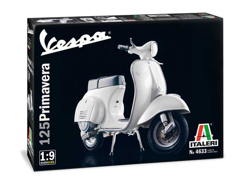 Plastikový model Italeri 4633 – motorka Vespa 125 Primavera v měřítku 1:9 ke slepení. Délka modelu 200 mm, obtížnost 3. Balení obsahuje SUPER OBTISKY.