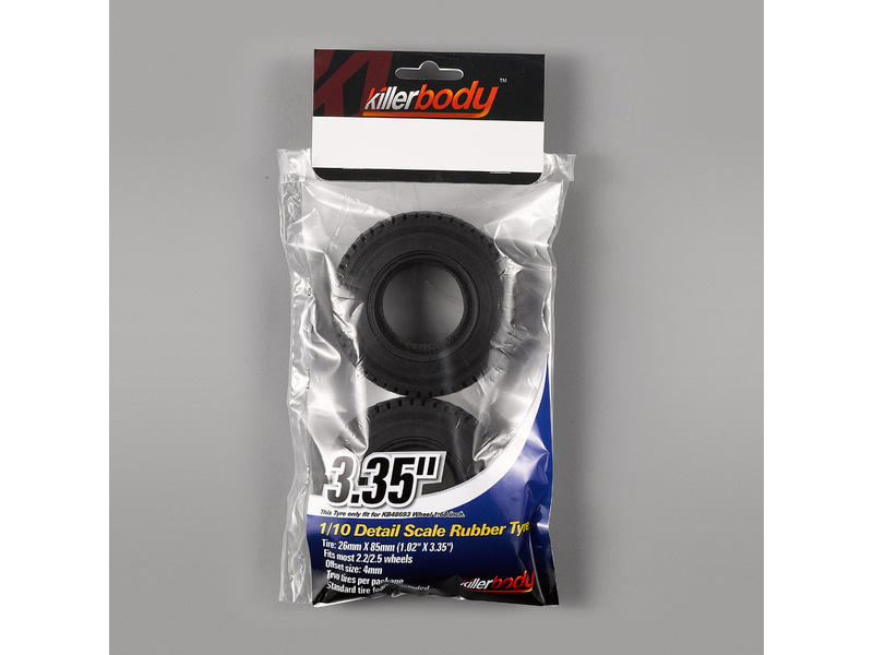 Killerbody Vám nabízí pneumatiky 3.35" s vložkou pro RC model auta 1:10. Pneumatiky jsou vyrobené z pryže o rozměru 26 mm X 85 mm ( 1,02 ”X 3,35” ) v černém detailním provedení. Hodí se na disky 1,68 ”KB48693.