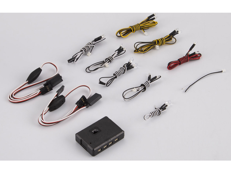 Balení obsahuje: řídící jednotku, 2 x 3 oranžové LED diody, 1 x 2 červené, LED diody, 5 x bílé LED diody celkem 9 ks, 2 x Y-kabely - Rx/servo, Rx/regulátor. Originální a český návod.