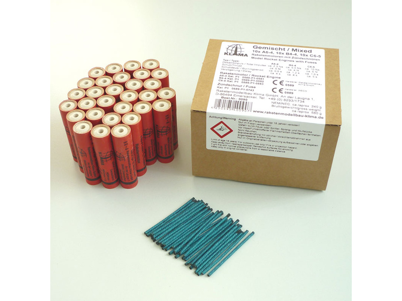 Obsahem balení je celkem 30 raketových motorků Klima jde o 3 druhy: A6-4 10ks, B4-4 10ks a C6-5 10ks včetně zápalnic, návod k použití.