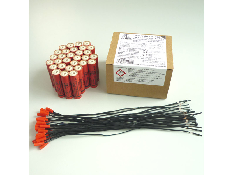 Balení obsahuje: celkem 30 raketových motorků Klima jde o 3 druhy: A6-4 10ks, B4-4 10ks a C6-5 10ks včetně elektrických palníků, návod k použití.