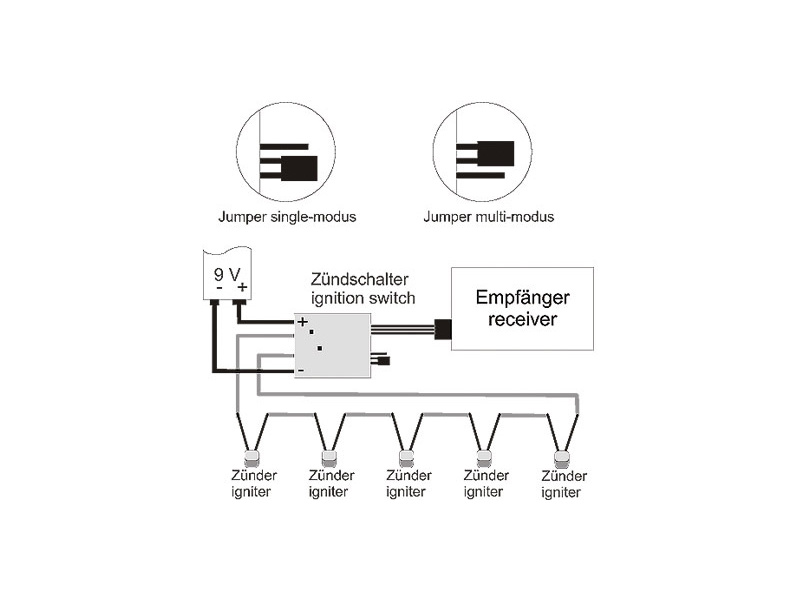 Při odpalu palníku rakety je doporučen Singl-mode - jednotlivý odpal, kdy po aktivaci přepínačem vysílače dojde ke krátkodobému impulzu. Při aktivaci Multi-mode (odejmutí propojky) se délka impulsu řídí délkou sepnutí přepínače vysílače.
