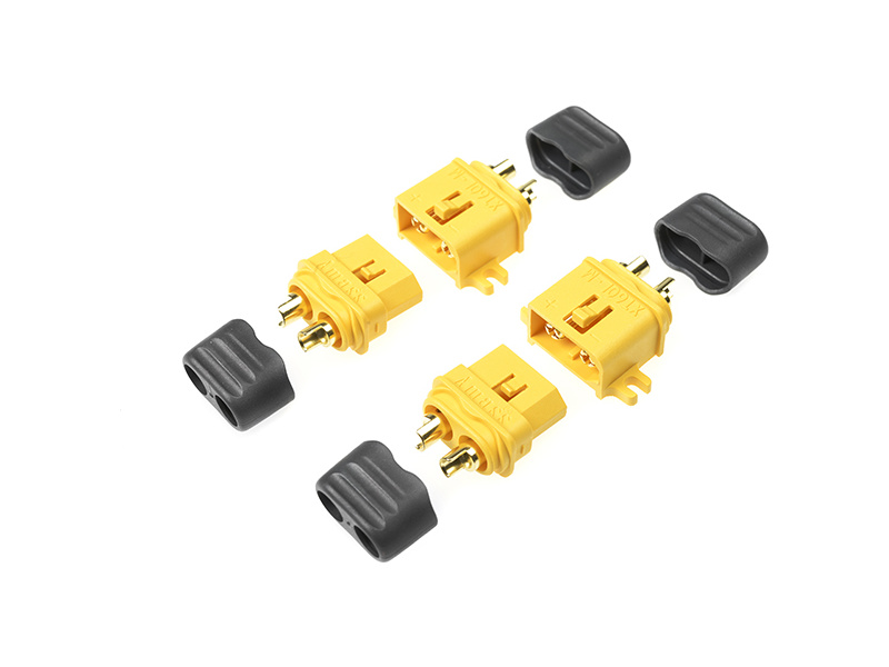 Zlacený konektor XT-60L s plastovým krytem a úchytkami pro šrouby. Balení obsahuje 2 páry.