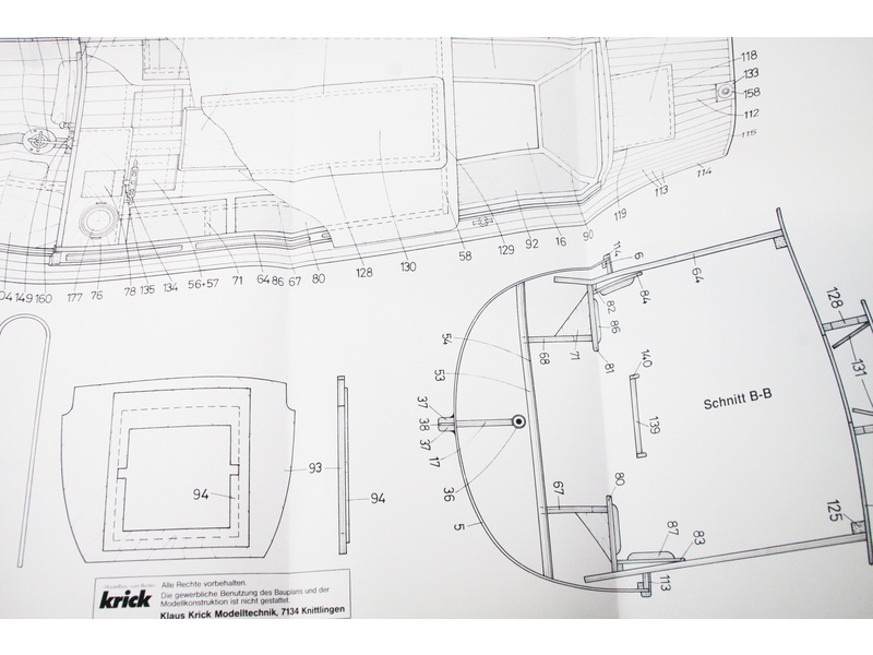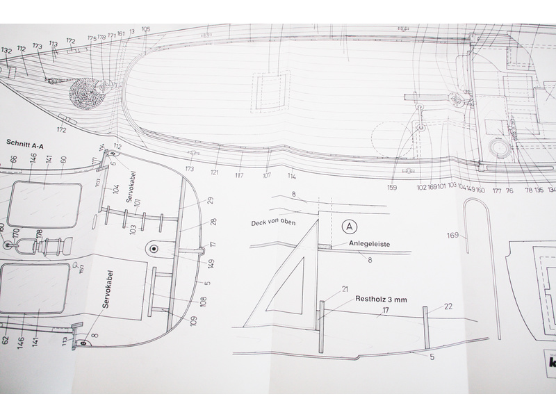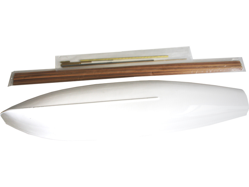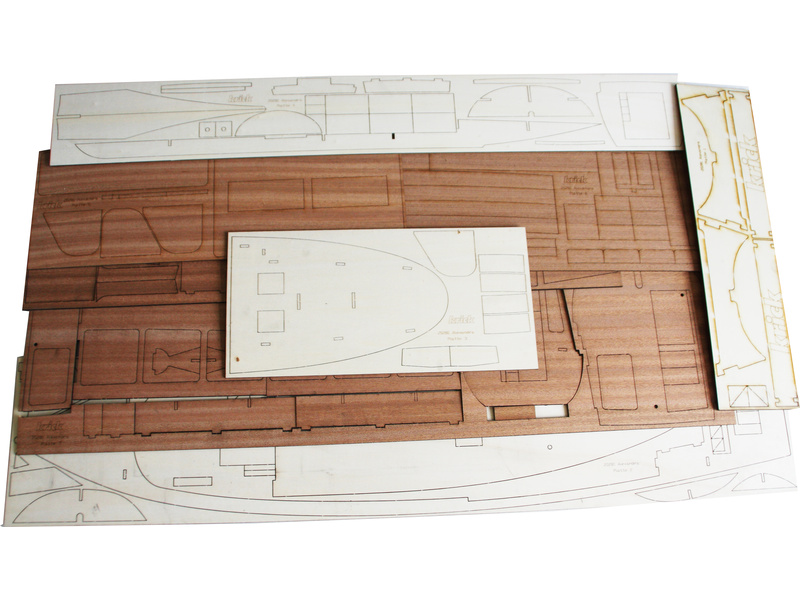 Po otevření víka krabice naleznete plastový ABS výlisek trupu, dřevěné díly modelu z překližky, sadu lišt, drobné součásti uzavřené v sáčcích, sadu výkresů a manuál.