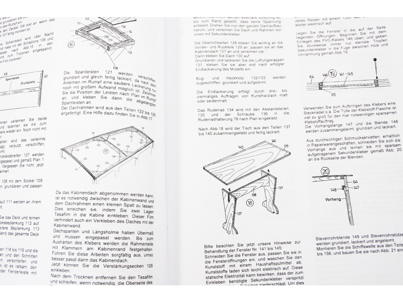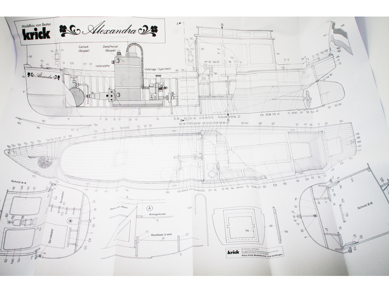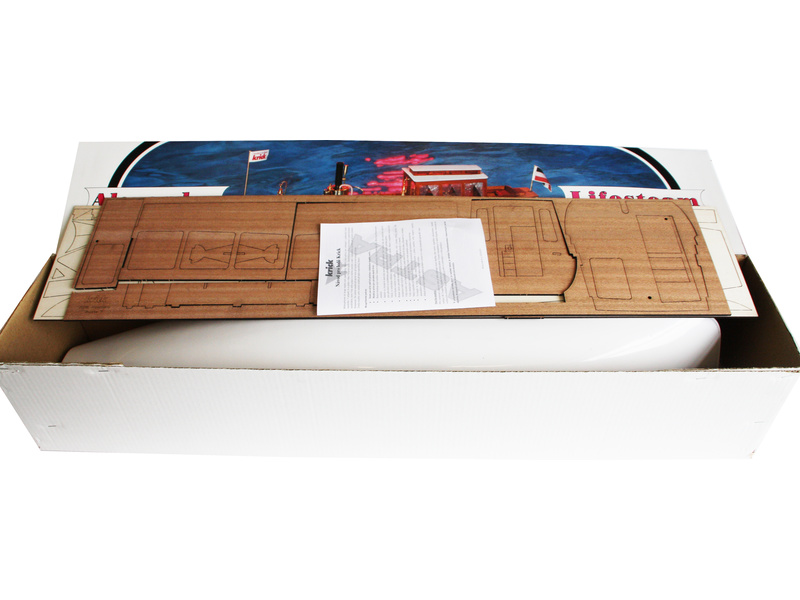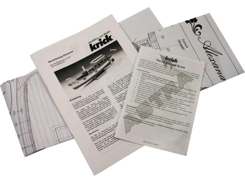 Stavebnice modelu lodi Krick Alexandra obsahuje plastový ABS výlisek trupu, dřevěné díly paluby, montážní součásti, německý manuál a pokyny k provozu.