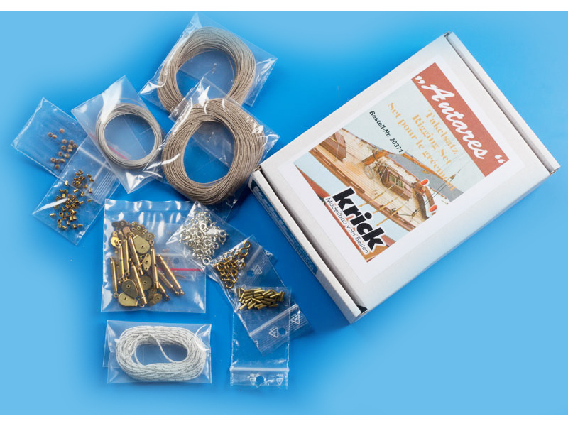 Krick Antares příslušenství. Sada obsahuje všechny díly pro lanoví stožáru, jako jsou mosazné bloky, napínáky, lana z nerezové oceli apod.