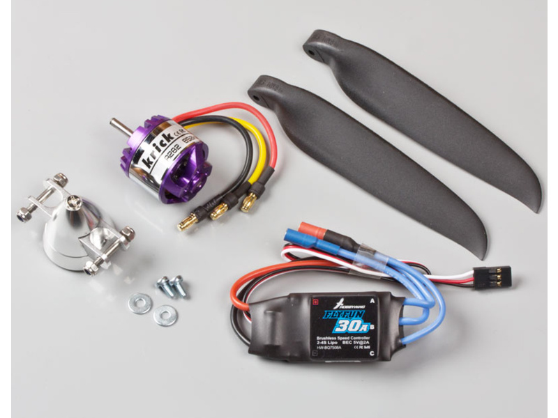 Pohonná jednotka pro RC model letadla Krick Habicht sestává ze střídavého motoru R282 a regulátoru 30A, hliníkového kužele 28mm se sklopnou vrtulí. Doporučena je pohonná baterie LiPol s 3S (11,1V) 1300 mAh.