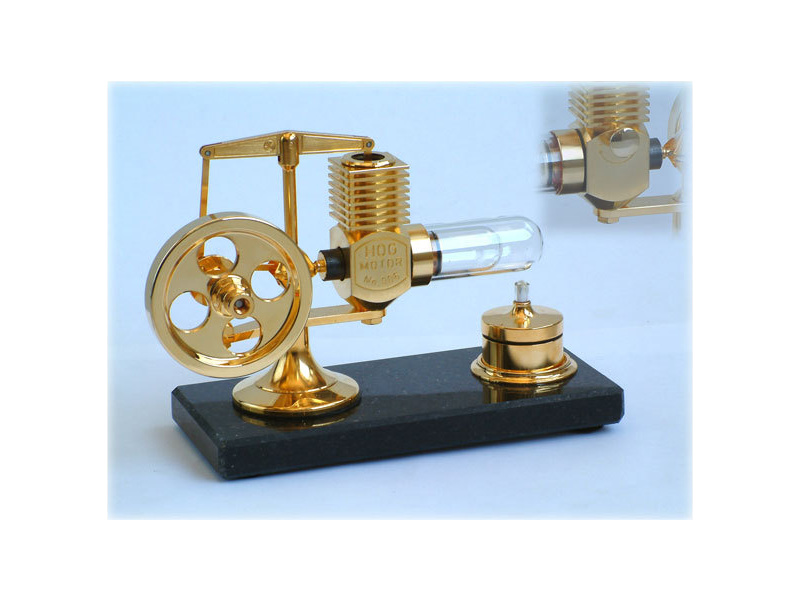 Krick Motor velůký Stirling zlatý smontovaný. Píst a ložisko výtlačného pístu jsou vyrobeny ze speciálního, samomazného materiálu. To znamená žádnou údržbu a dlouhou životnost. Palivem je denaturovaný líh, dlouhá doba provozu. Vyroben z pozlacené mosazi.