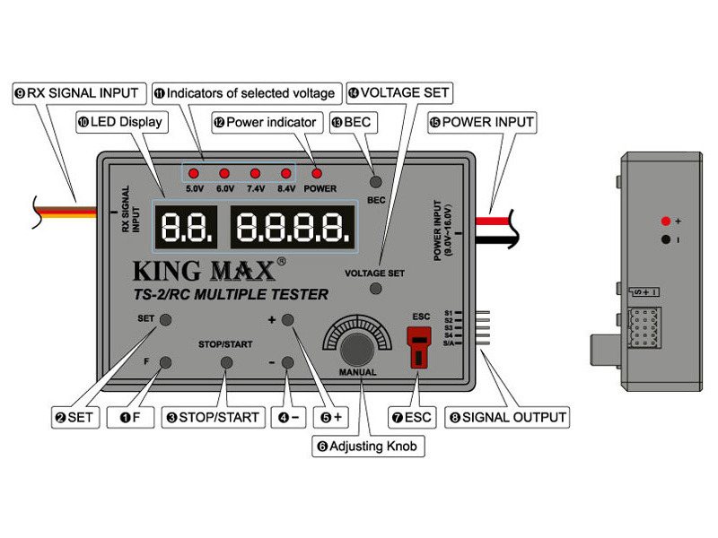 Tester je vybaven LED displejem, ovládacími tlačítky, otočným potenciometrem a indikační LED. Připojení regulátoru Deans konektorem.