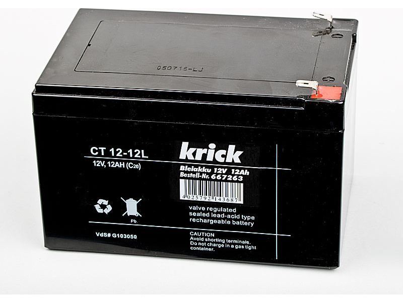 Krick Olověný akumulátor, napětí 12V kapacita 12Ah, rozměry 98x101x151mm, hmotnost 4000g. Nabíjení 0,2C
