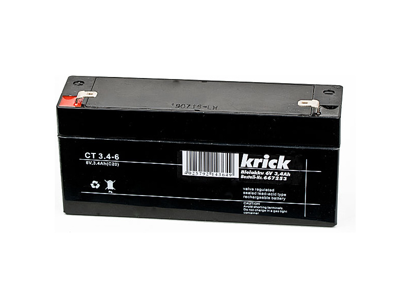 Krick Olověný akumulátor, napětí 6V kapacita 3,4Ah, rozměry 34x66x134mm, hmotnost 320g.