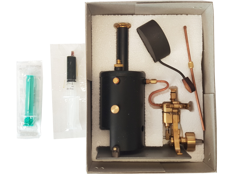 Balení obsahuje parní stroj, injekční stříkačku s olejem pro mazání, náhradní injekční stříkačku, trubičku pro odvod zbytkové vody, návod k použití v němčině.