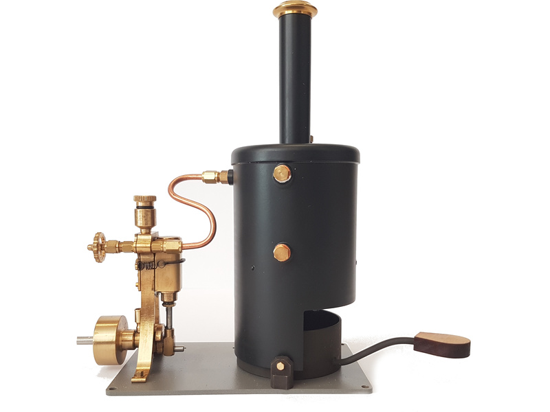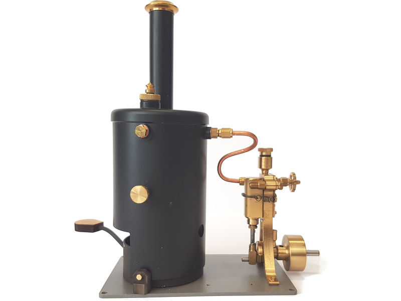 Maketový parní stroj pro autentický pohon modelů lodí. Parní kotel na tuhý líh pohání jedno-válcový parní stroj.