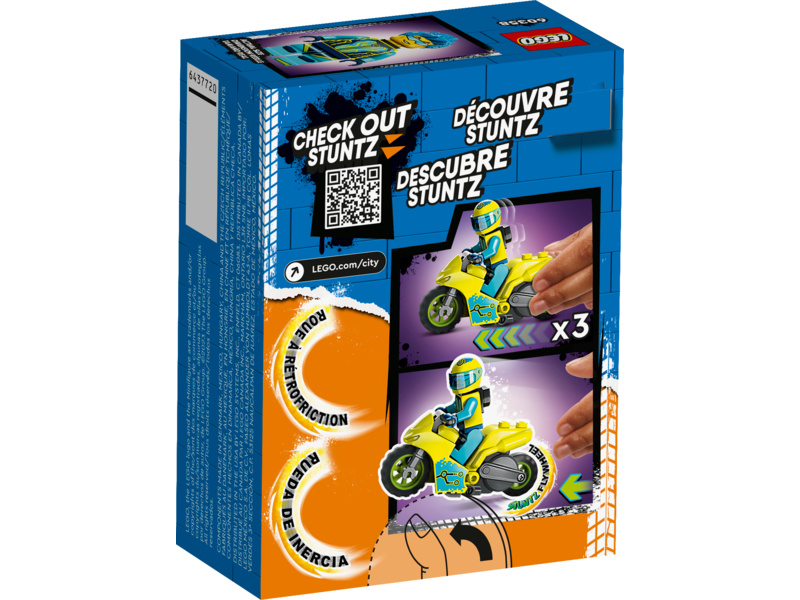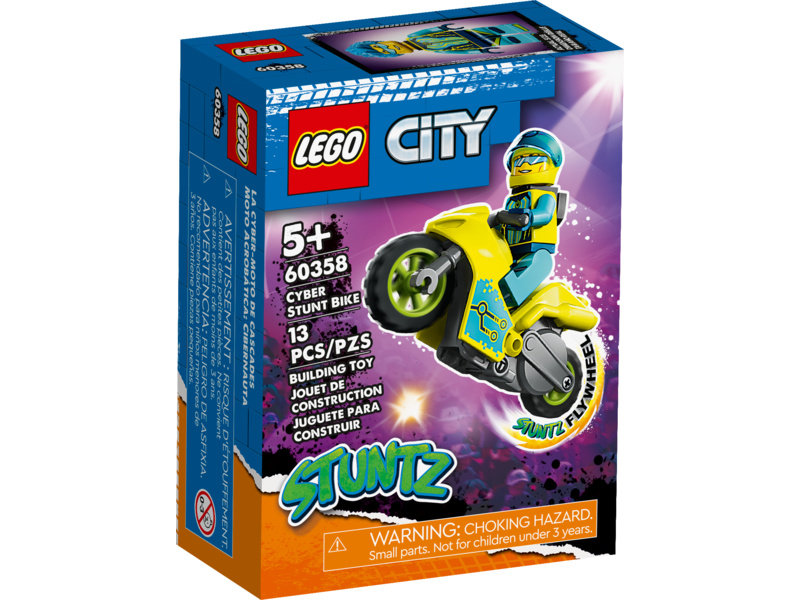 - Motorka se setrvačníkem – Obohaťte dětské herní možnosti stavebnicí Kaskadérská kybermotorka (60358) od LEGO® City, která přináší skutečnou kaskadérskou akci