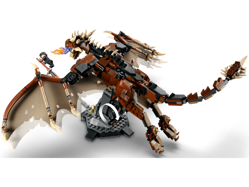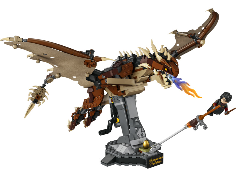 Model maďarského trnoocasáho draka z kostek s černými šupinami, špičatým ocasem a ohnivým dechem. Toto ikonické stvoření představuje nejen jedinečný výstavní kousek, ale umožňuje dětem s modelem také létat. Klička na zadní straně slouží k ovládání mechanismu, který pohybuje křídly s rozpětím 40 cm nahoru a dolů. Tento sběratelský model stojí na bytelném podstavci a je doplněn minifigurkou Harryho Pottera na koštěti. Kouzelná je pak i bezplatná aplikace LEGO s návody, která dětem umožňuje si model během stavění přibližovat a otáčet.