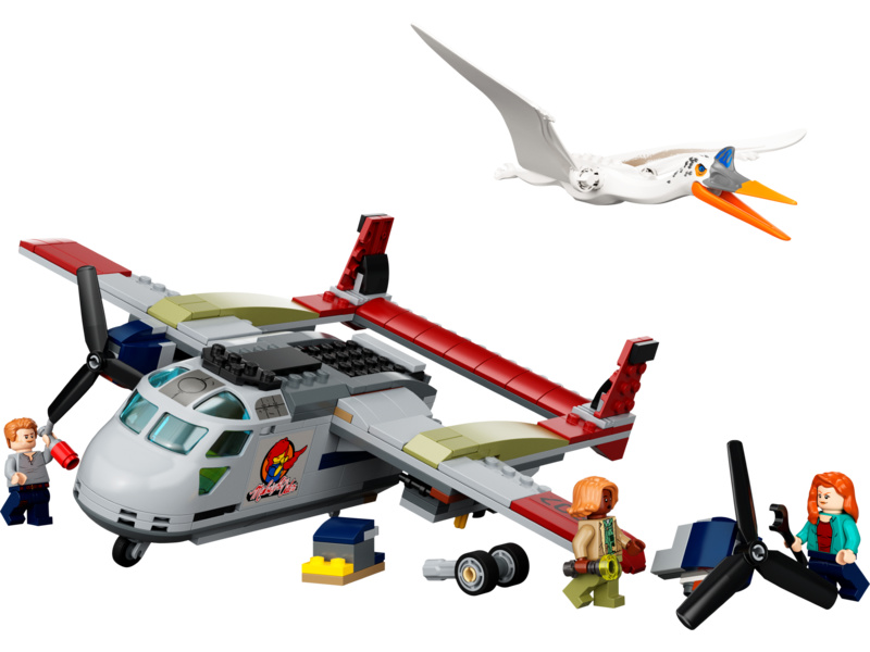 - Figurka pterosaura a 3 minifigurky – Owen Grady, Claire Dearingová a Kayla Wattsová. Quetzalcoatlus měří přes 29 cm na šířku a má polohovatelná křídla a ostrý zobák