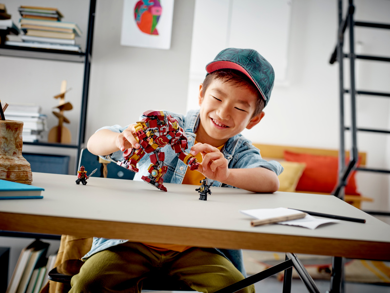 Tato všestranná stavebnice inspirovaná scénou z filmu Avengers: Infinity War studia Marvel zaujme obřím oblekem Hulkbuster s několika klouby, které dětem umožňují robota snadno polohovat a různě s ním pohybovat. Uzamčené kolenní klouby poskytují vynikající stabilitu a v otevíracím kokpitu je prostor na minifigurku pilota. Součástí jsou 4 minifigurky: Bruce Banner, Okoye a 2 outrideři. Na druhé straně otáčecí hlavy Bruce Bannera je vyobrazena jeho zelenající tvář. Okoye má v ruce kopí. Pro ještě více digitální zábavy je zde aplikace LEGO Builder s intuitivními nástroji přibližování a otáčení, které dětem umožní vizualizovat si model, zatímco na něm pracují.