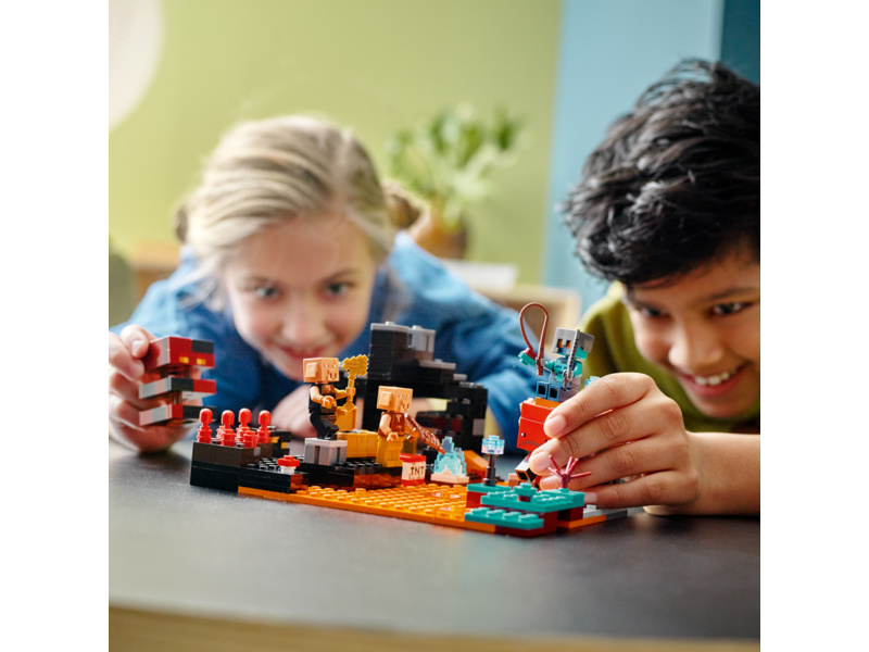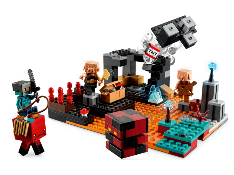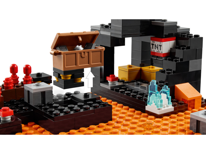 Hráči musí překonat řadu překážek a proklestit si cestu do planoucího podzemní hradu, kde získají suroviny, které jim otevřou ještě kreativnější herní možnosti. Postavy inspirované hrou Minecraft zahrnují podzemního dobrodruha, pekelný sliz, pigliního bojovníka, piglina a chodce. Model nabízí hned několik speciálních prvků, jako je například funkce exploze pomocí TNT, které lze odpálit pomocí páčky. Mezi autentickými doplňky ze hry děti najdou rudý kořen, množství nejrůznějších hub, pozlacený blackstone, oheň a louče duší, bloky zlata, podzemní zlatou rudu, a taky zbraně – zlatou sekeru, kuši a netheritový meč. Dále nechybí ani TNT, rybářský prut a truhla s pokladem ukrývající úlomky netheritu, železné nugety a vepřovou kotletu. Stejně jako výtvory ve hře, i tento model lze přestavovat a prožívat neustále nová dobrodružství.