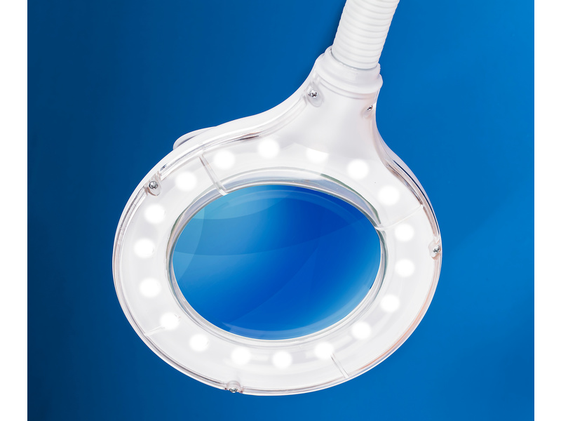 Lightcraft pracovní ohebná LED lampa, s lupou, osvětlením, polohovatelným ramenem stojanu a stabilním podstavcem je určena pro detailní práci. 30 bílých LED diod (2 W), kvalitní skleněná čočka o průměru 100 mm, zvětšení 3 dioptrie 1,75x zvětšení. Ideální pro čtení, řemeslo a profi i hobby použití. Napájení ze sítě 220 - 240 V. Ve velké čočce je integrovaná malá čočka pro detailní zvětšení až 4x.