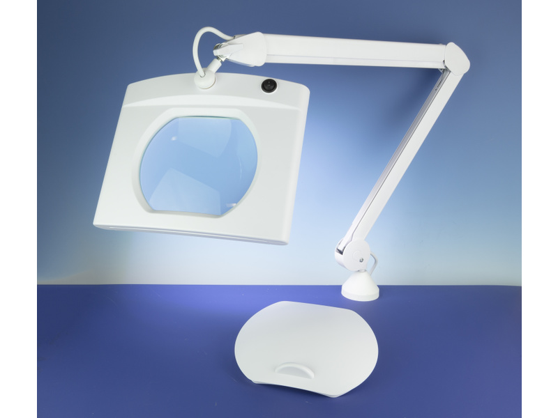 Energeticky úsporná LED Lightcraft stolní lampa s obdelníkovým držákem lupy s vysoce kvalitním širokým skleněným objektivem pro detailní a složité práce. Flexibilní kloubové rameno s dlouhým dosahem pro přesné polohování bez prokluzu. Vysoce kvalitní čočka 190 x 160 mm, 3 dioptrie (1,75x zvětšení). 62 LED se svítivostí 6300K, spotřeba 17,5W, napájení ze sítě.