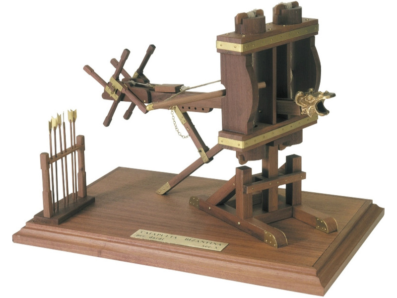 Stavebnice modelu Byzantského katapultu v měřítku 1:17. Model vychází z původní kresby s 10. století. Zbraň střílela šípy s výbornou přesností a průrazností. Konstrukce se skládá z předem nařezaných dřevěných dílů a kovových litých ozdob.