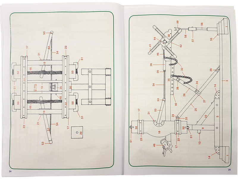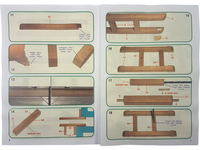Balení obsahuje laserem vyřezávané dřevěné díly, kovové odlitky, lana, obrázkový návod ke stavbě.