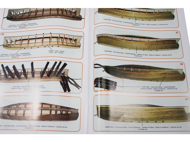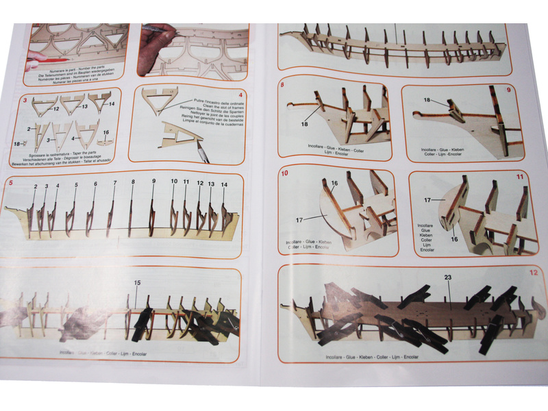 Stavebnice je vybavena přesně pasujícími dřevěnými díly řezanými laserem, potřebnými lištami a kováním. Součástí je také stojan na loď.
