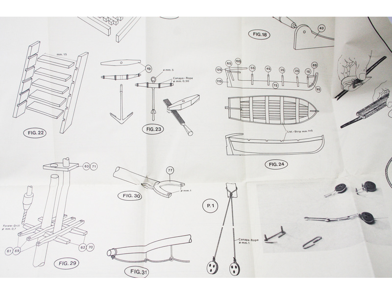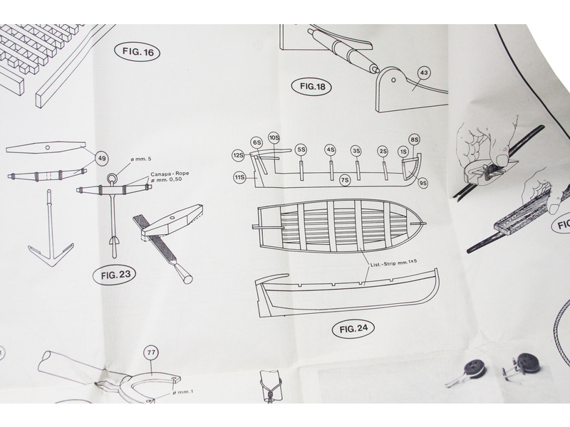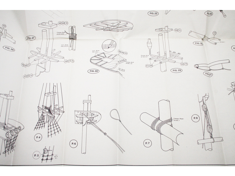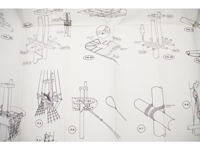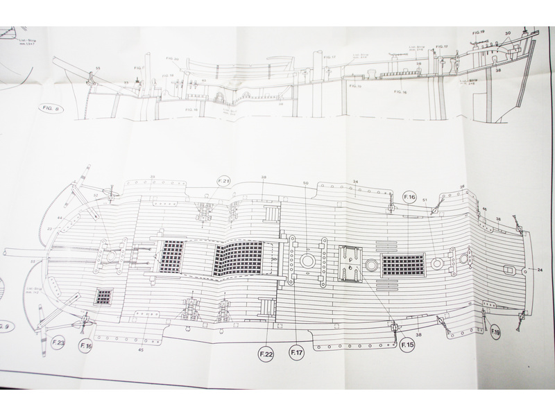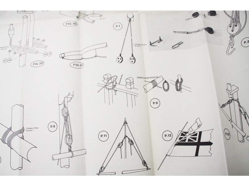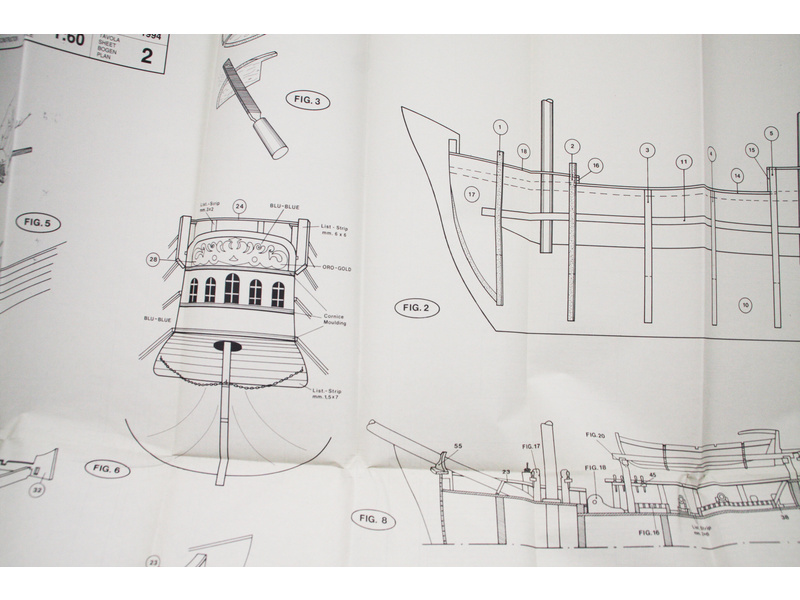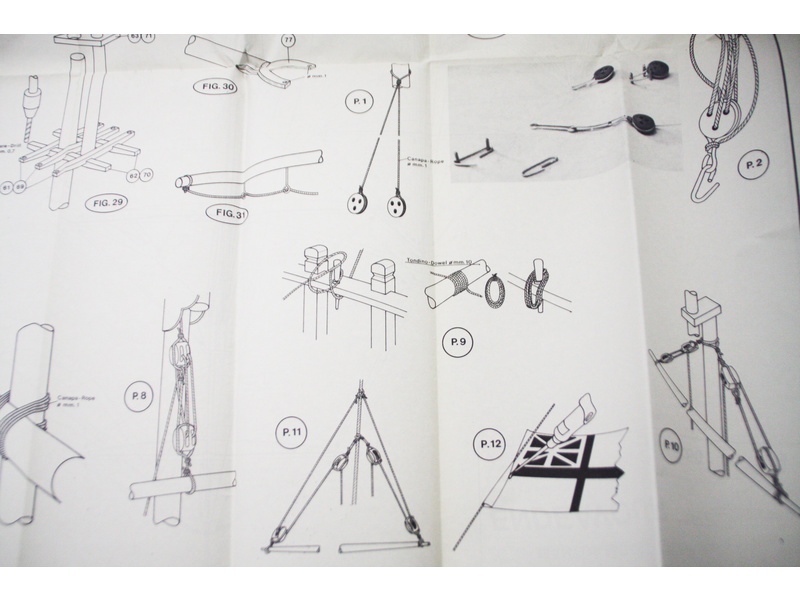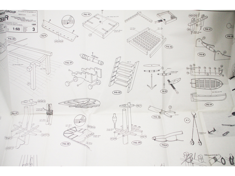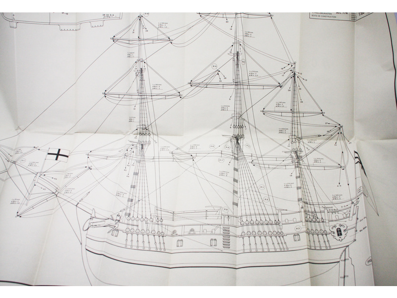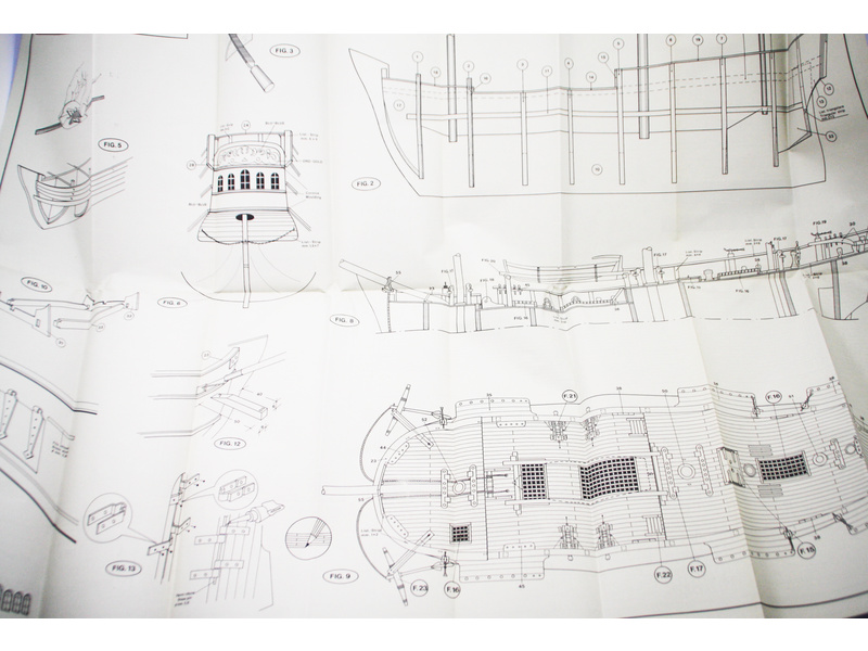 Balení obsahuje laserem řezané dřevěné díly, plaňky, paluby, stožáry, kovové a dřevěné kování, kovové odlitky a dekorace vyleptané z mosazi. Stavební plány, vícejazyčný návod.