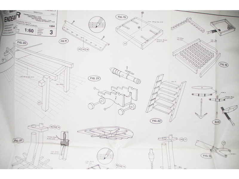 Stavebnice neplovoucího modelu lodi Mantua Endeavour v měřítku 1:60 a délce 770 mm. Loď slavného kapitána Cooka. Kit obsahuje dřevěné díly, kovové odlitky dekorací a podrobné stavební plány.