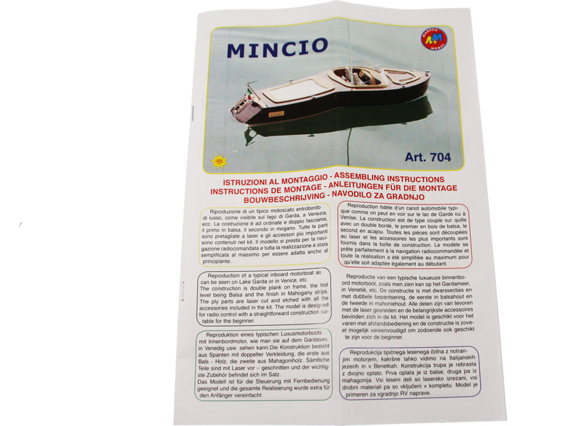 Stavebnice neplovoucího modelu lodi Mantua Model Mincio v měřítku 1:20 a délce 450mm pro začínající i pokročilé modeláře. Typický luxusní motorový člun. Skutečné lodi jsou k vidění na jezeře Garda nebo v Benátkách. Tyto elegantní dřevěné lodě vyzařují velmi zvláštní fascinaci. Abychom získali levný a ne příliš velký model, bylo vybráno běžné měřítko 1:20. Stavebnice obsahuje dřevěné díly vyřezané laserem, drobné díly pro dokončení modelu, stavební plány a návod s výkresy řezů. Součástí je také stojánek lodi.