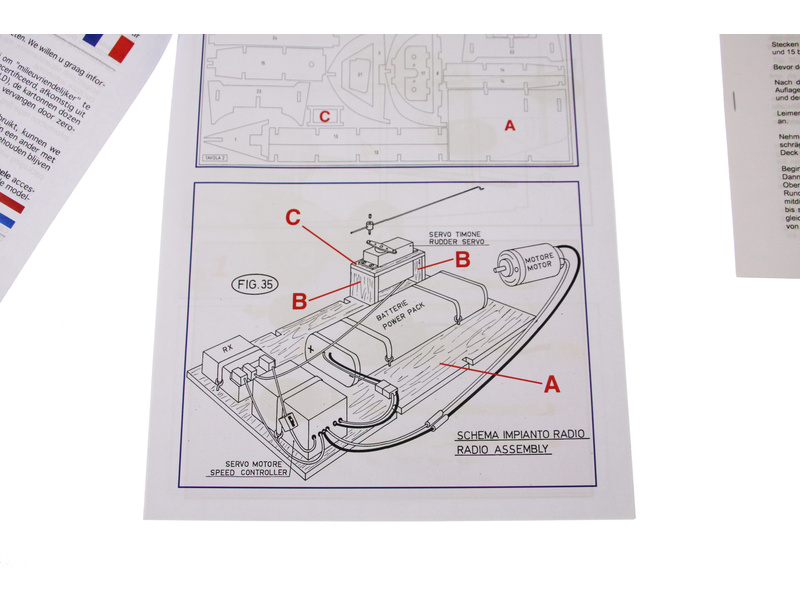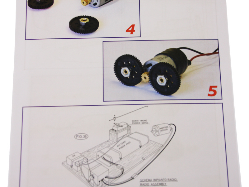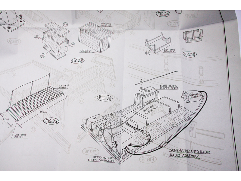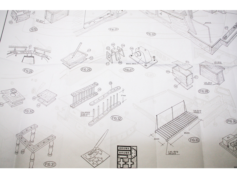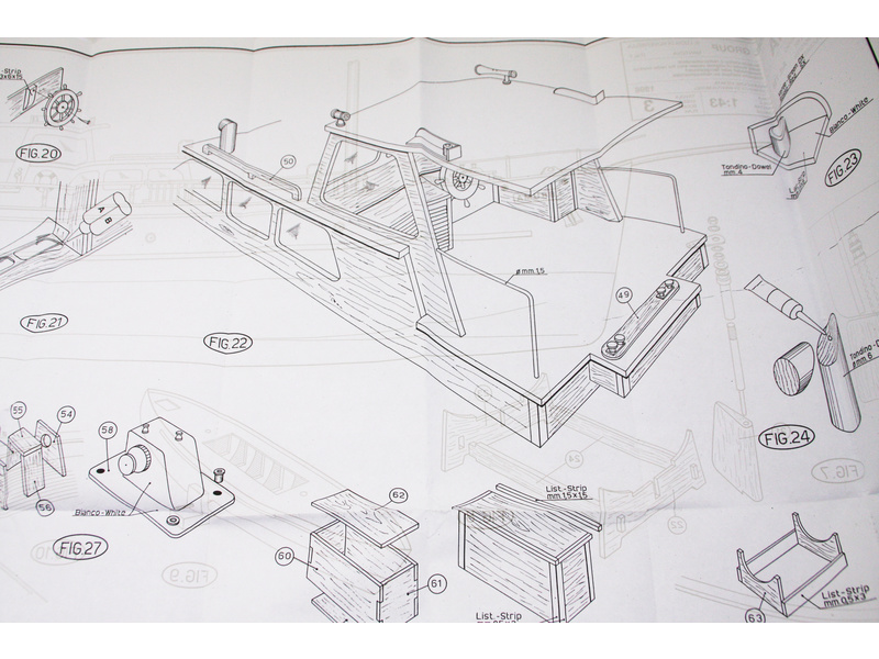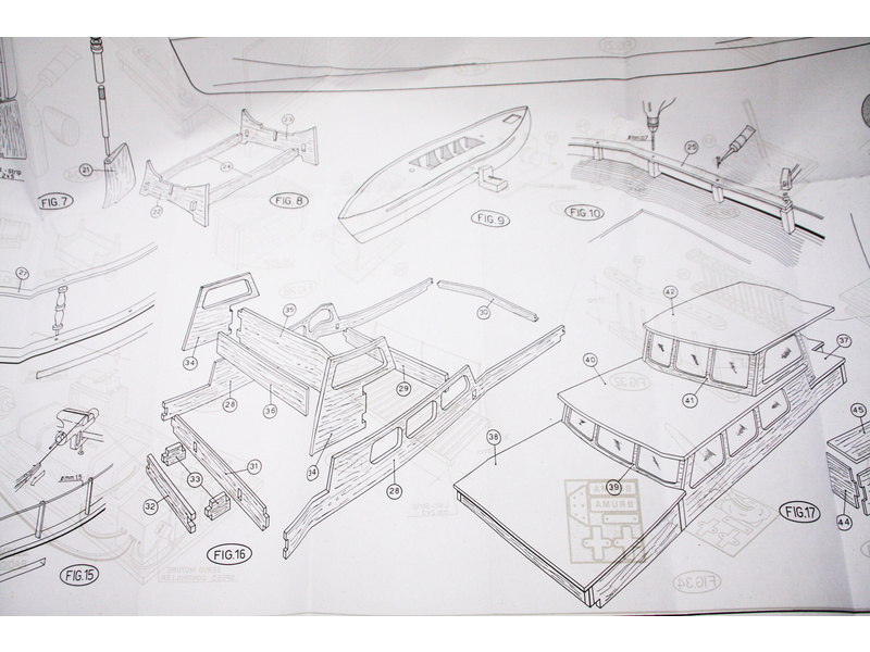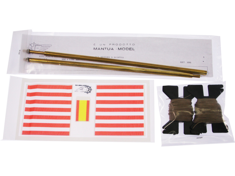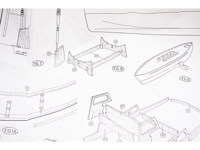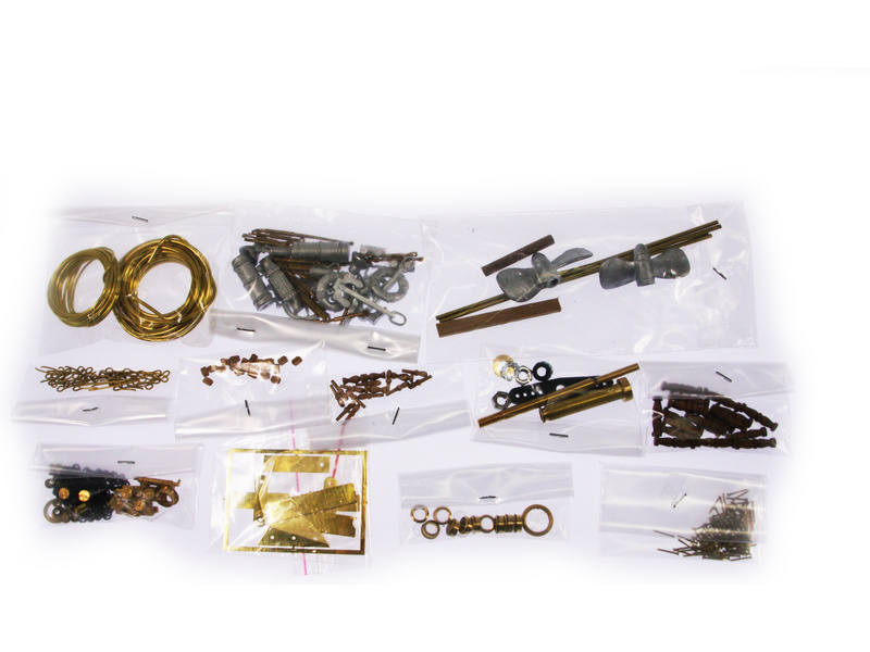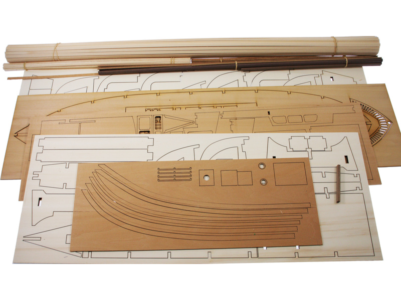 Balení obsahuje sadu překližkových dílů, sadu dřevěných lišt o různém průřezu, blistr s drobnými díly, díly z mosazi, dvě lodní hřídele s lodními šrouby prům. 40mm a závity M4, sadu výkresů a vícejazyčný manuál.