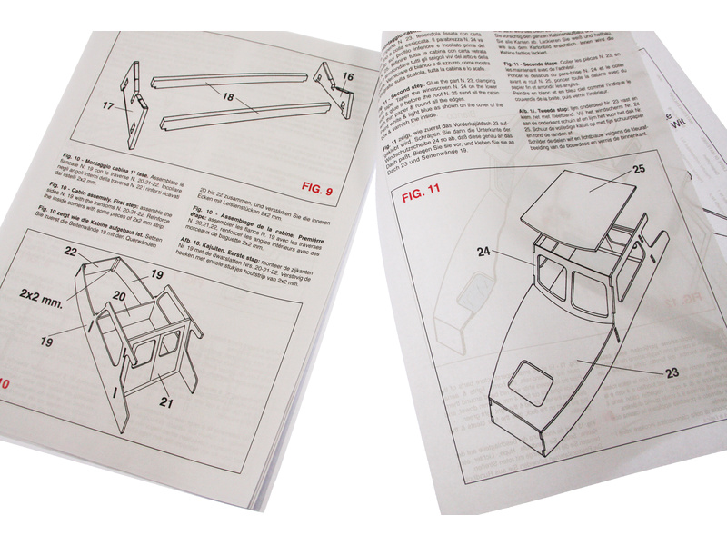 Balení obsahuje sadu překližkových dílů, dřevěné díly, drobné díly pro dokončení modelu, stavební plány, návod s výkresy a vícejazyčný manuál.