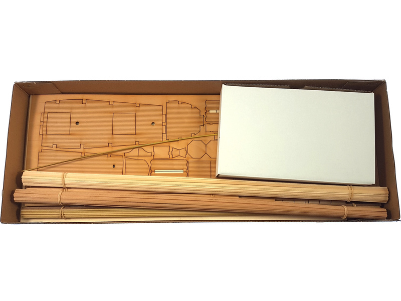 Po otevření víka krabice naleznete dřevěné díly modelu z překližky, lišty, drobné součásti v plastových sáčcích a manuál.