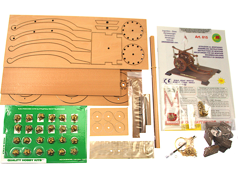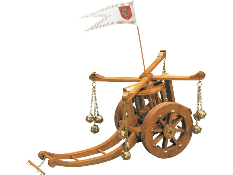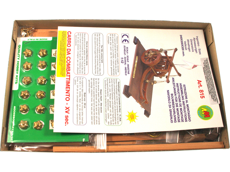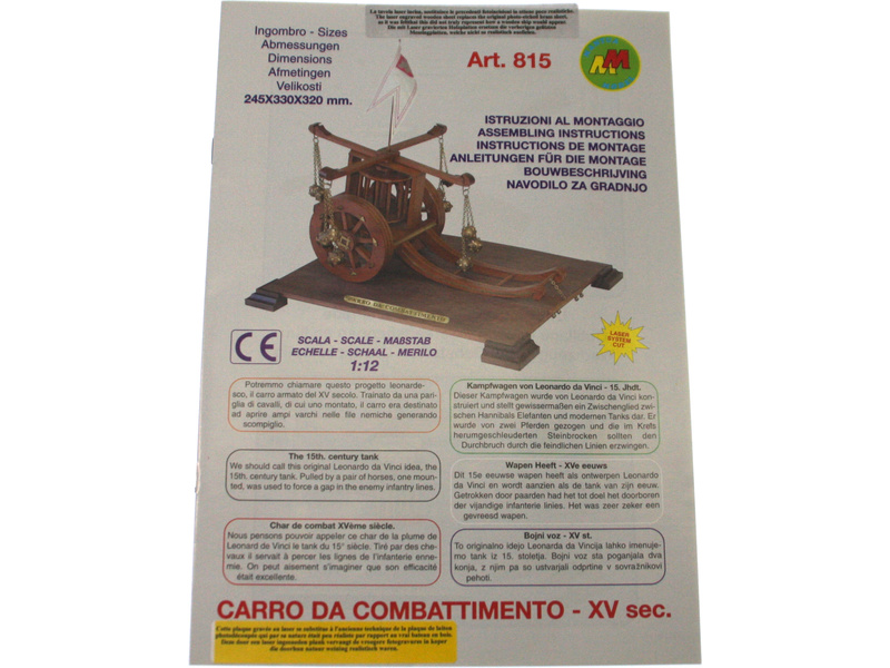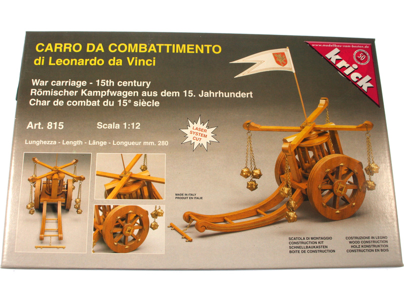 Stavebnice modelu Římského bojového vozu z 15. století v měřítku 1:12. Tento vůz navrhl Leonardo da Vinci. Byl tažen párem koní. Rotující kovové koule sloužily k proražení nepřátelské linie. Konstrukce se skládá z předem nařezaných dřevěných dílů a kovových litých ozdob.
