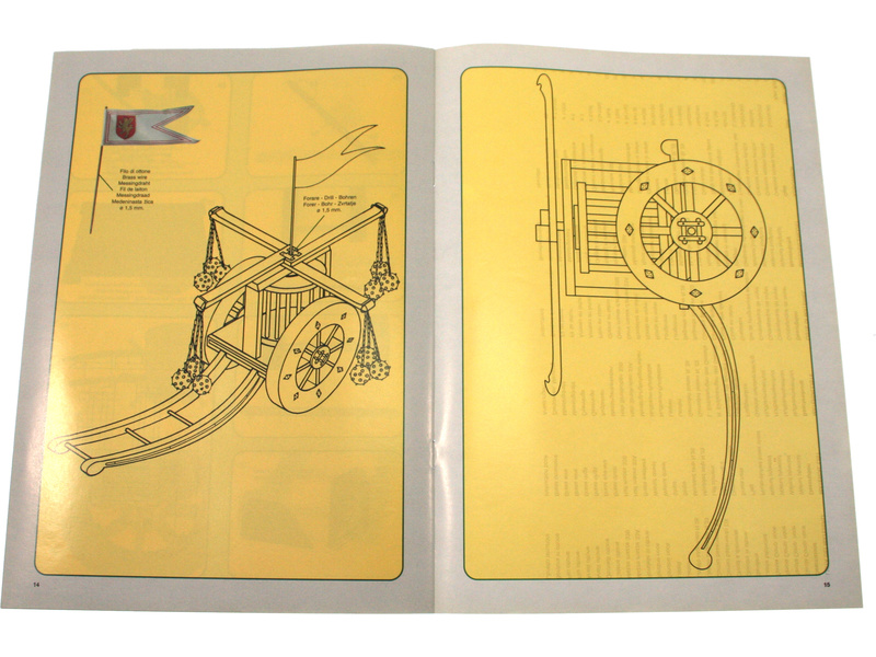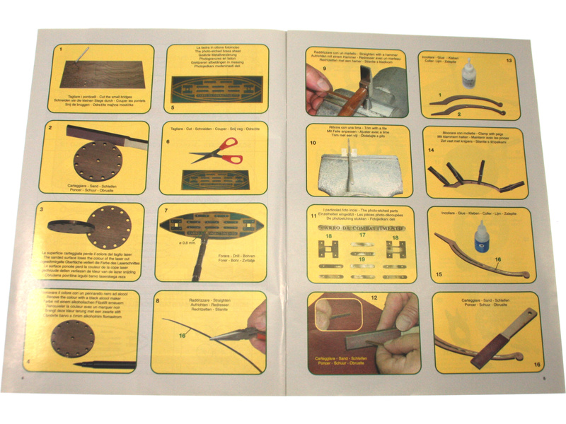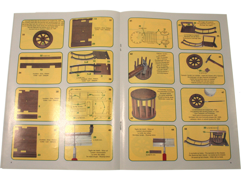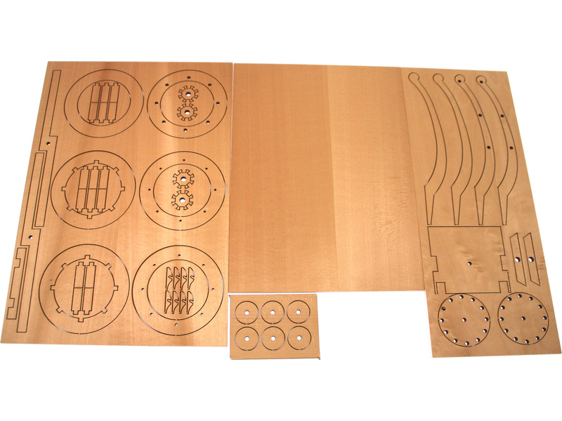 Balení obsahuje laserem vyřezávané dřevěné díly, kovové odlitky a obrázkový vícejazyčný návod ke stavbě.
