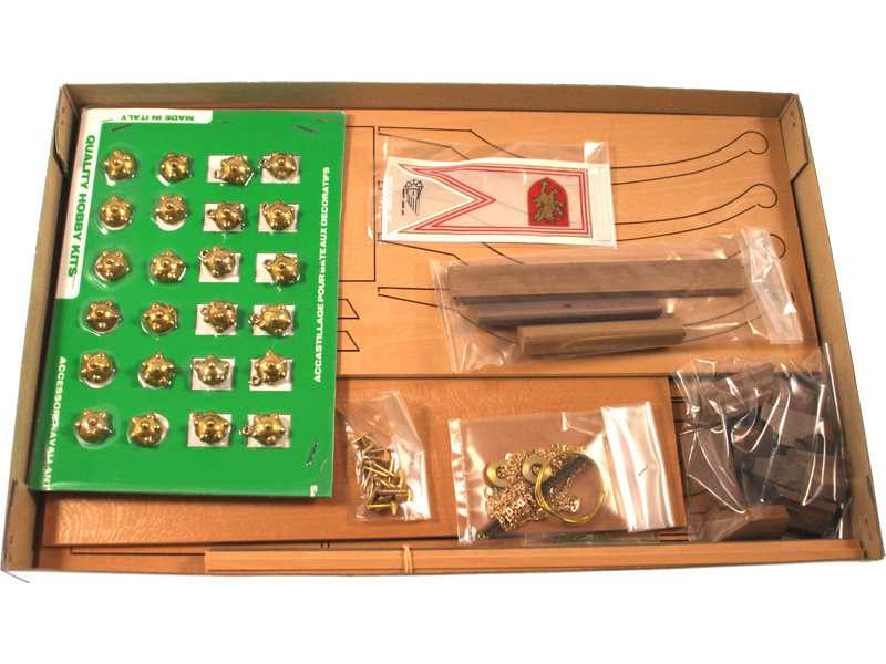 Po otevření víka krabice naleznete dřevěné díly modelu z překližky, lišty, drobné součásti v plastových sáčcích a manuál.