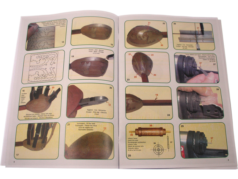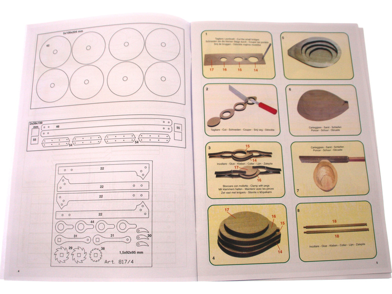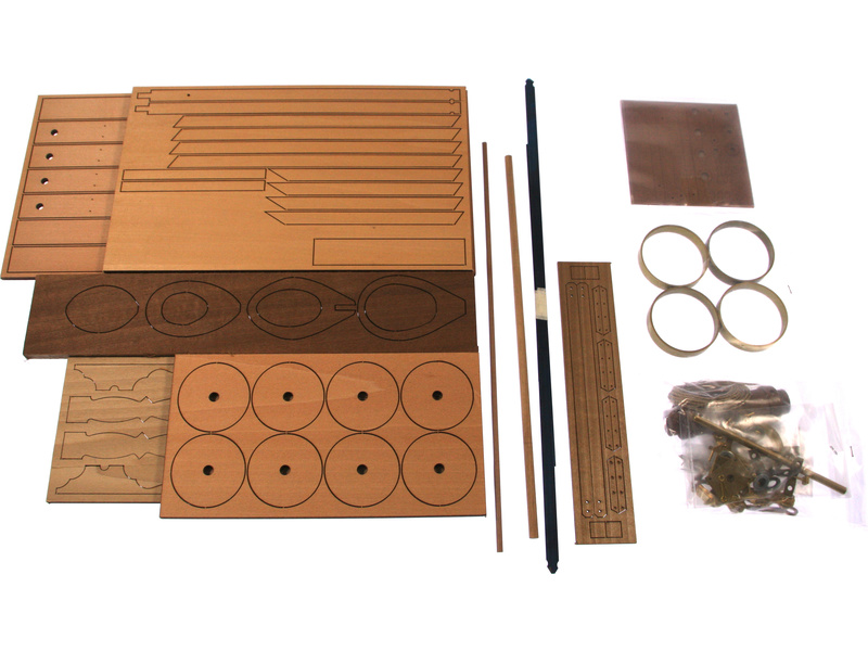 Balení obsahuje laserem vyřezávané dřevěné díly, kovové odlitky, lana, detailní obrázkový návod ke stavbě.