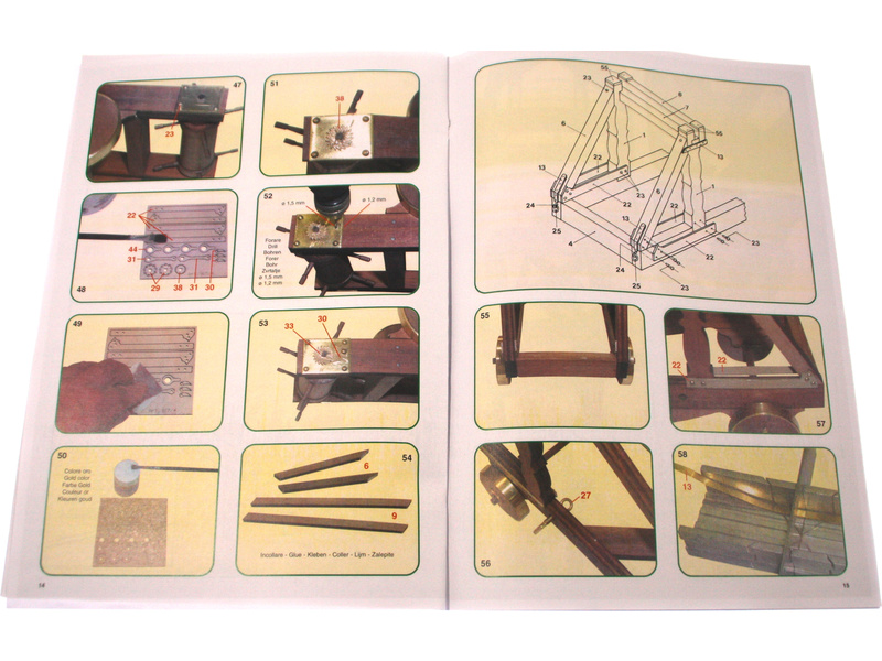 Stavebnice modelu Římského katapultu v měřítku 1:12. Konstrukce se skládá z předem nařezaných dřevěných dílů a kovových litých ozdob. Předloha katapultu pochází z 1. století našeho letopočtu. Originál katapultu je umístěn v muzeu v Římě.