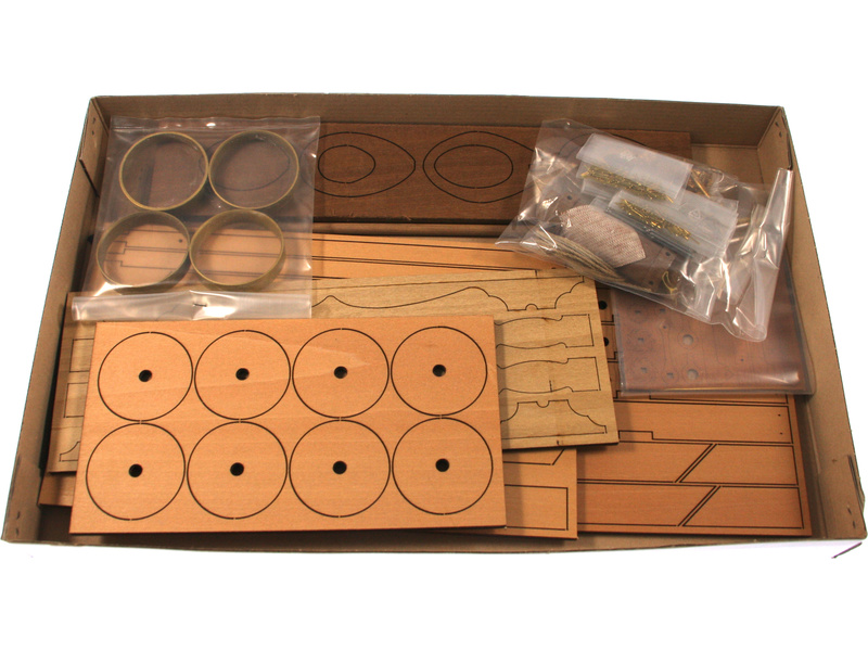 Po otevření víka krabice naleznete dřevěné díly modelu z překližky, lišty, drobné součásti v plastových sáčcích a manuál.
