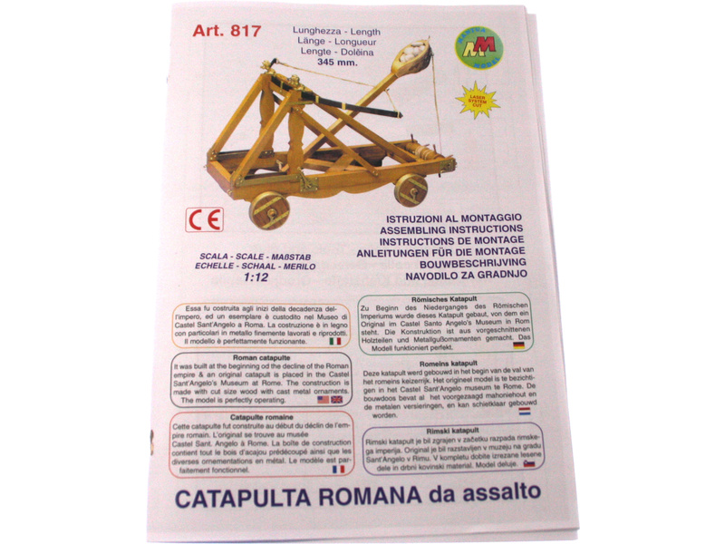 Stavebnice modelu Římského katapultu v měřítku 1:12. Konstrukce se skládá z předem nařezaných dřevěných dílů a kovových litých ozdob. Předloha katapultu pochází z 1. století našeho letopočtu. Originál katapultu je umístěn v muzeu "Castel Santo Angelos" v Římě. Zbraň používala jednoduché odpalovací rameno na principu luku. Tento systém byl velmi účinný při obléhání pevností, ničení opevnění měst apod. Jako projektil se používaly kameny nebo celé kamenné koule. Pomocí katapultů se také někdy vrhali padlí vojáci a koně, kteří měli rozšířit infekce v oblehaném místě.