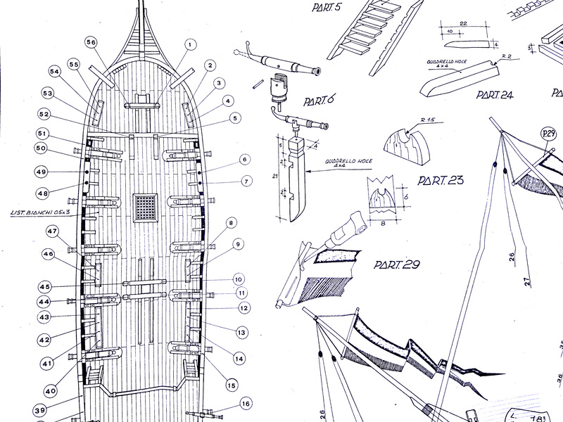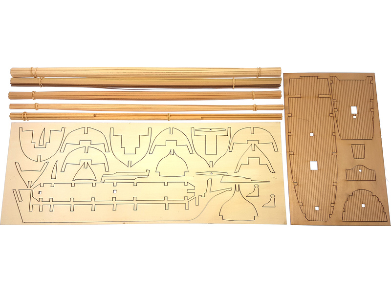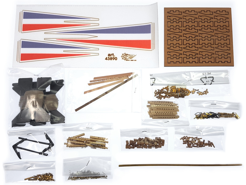 Balení obsahuje laserem řezané dřevěné díly, plaňky, stožáry, vlajky, lanoví, kovové a dřevěné kování a dekorace z mosazi. Stavební plány a vícejazyčný manuál.