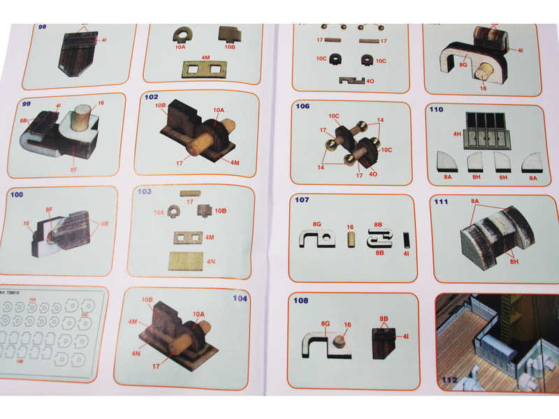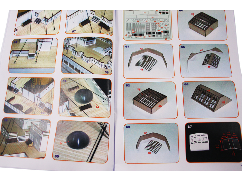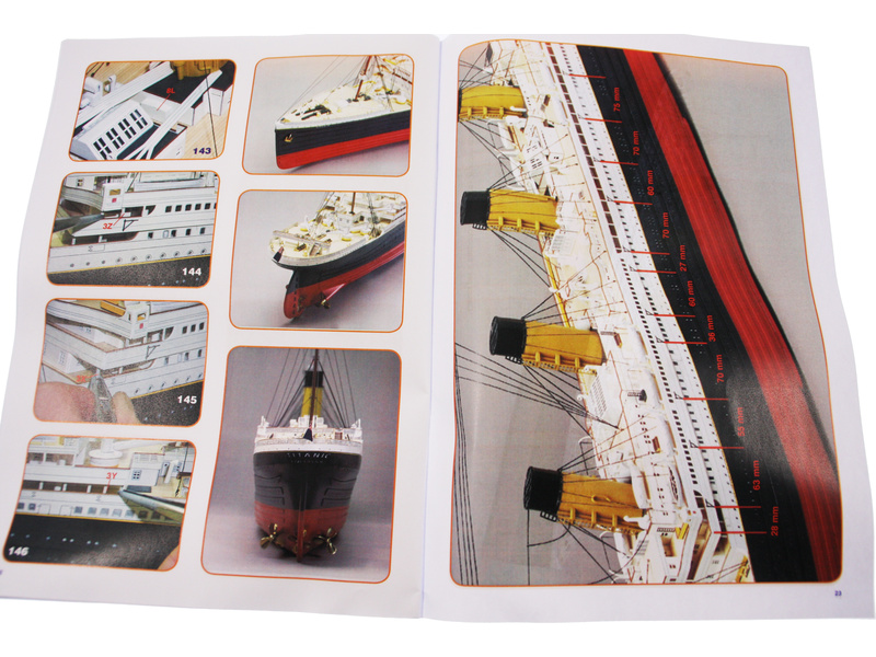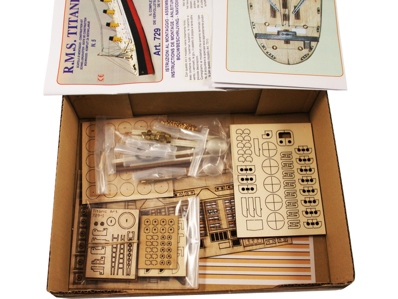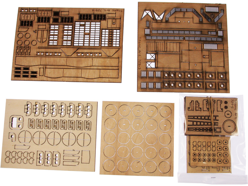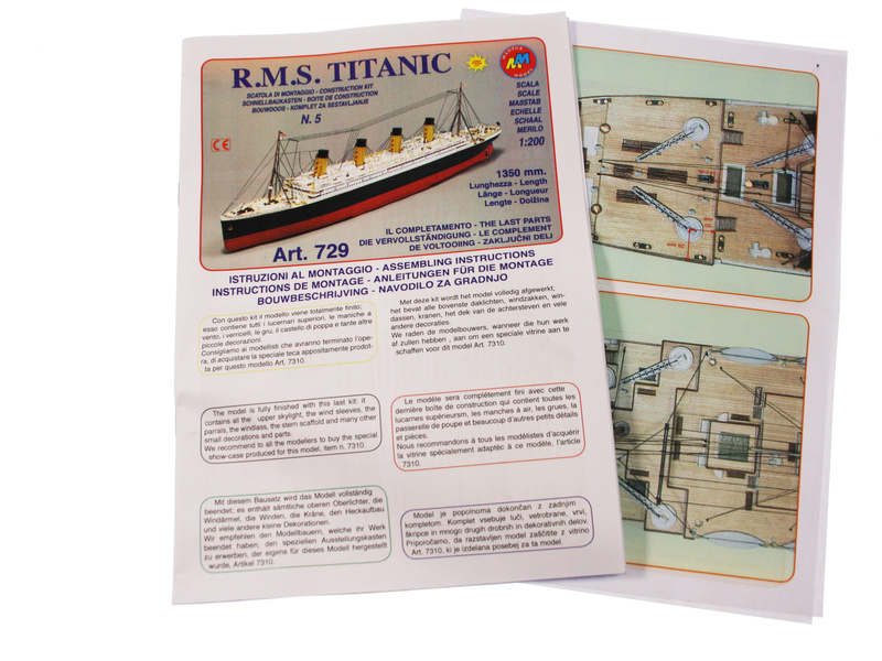 Mantua Model Titanic 1:200 sada č.5 kit v měřítku 1: 200 a délce 1350mm. Titanic je vlajkovou lodí řady Mantua Model. Bylo vybráno měřítko 1: 200 s rozměrem trupu 1350 mm na délku a 140 mm na šířku pro možnost podrobného zpracování detailů. Titanic je dodáván ve dvou verzích statických nebo v provedení RC. Aby modelář mohl stavět postupně, je stavebnice rozčleněna do 5 samostatně prodejných sad. Můžete si zakoupit kompletní sadu nebo jednotlivé sety podle vlastní potřeby. Sada se skládá z 5 částí, z nichž první (KR-800725) je trup a přední a zadní paluba, druhá sada (KR-800726) je balíček motorů pro instalaci funkčního rádiové ovládání, třetí sada (KR-800727) jsou boční panely oken trupu, přídě a zádi, detaily a kování, čtvrtá sada (KR-800728) je střední paluba včetně komínů a pátá (KR-800730) jsou součásti k dokončení palub a nástaveb, sada kování.. Konstrukce je obecně z přepážek na kýlu s laserem řezanými a leptanými dřevěnými detaily. Součástí je anglický návod a foto detaily.