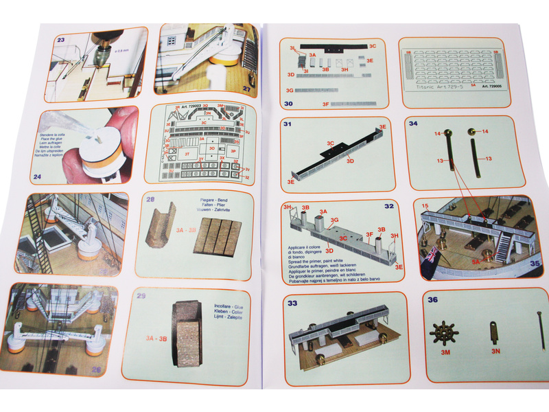 Mantua Model Titanic 1:200 sada č.5 kit v měřítku 1: 200 a délce 1350mm. Titanic je vlajkovou lodí řady Mantua Model, který se sestaví z 5 setů. Sada č.5 obsahuje součásti k dokončení palub a nástaveb, sada kování. Součástí je anglický návod a foto detaily.