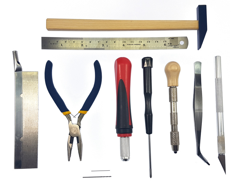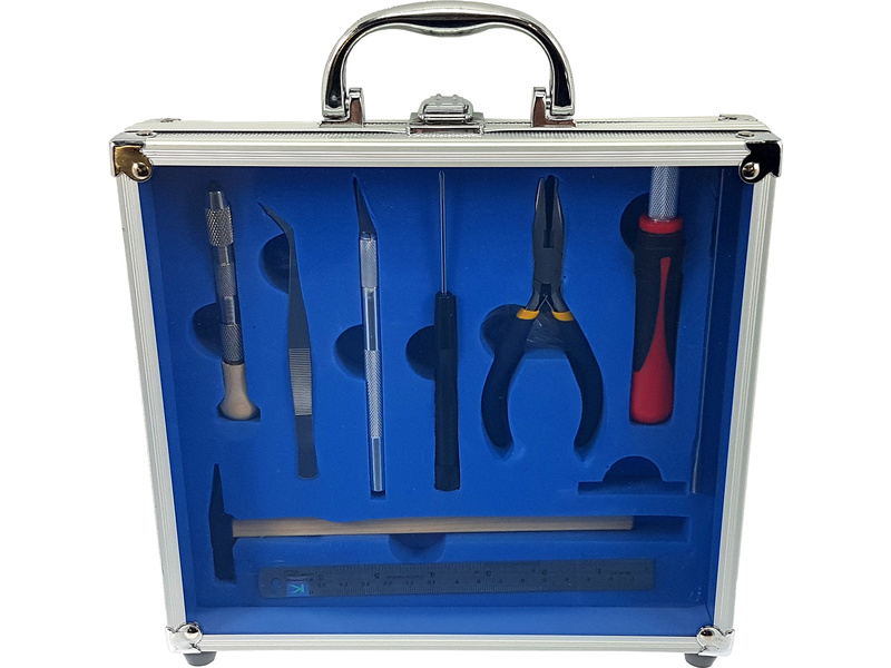Modelcraft kvalitní nářadí pro železniční modeláře, vhodné pro jemné a přesné práce. Sada dvanácti kusů, včetně řezací podložky formátu A5, v praktickém hliníkovém kufříku. Obsahuje: mini kladívko, pravítko, pilku, kleště, šroubovák, mini ruční vrtačka s vrtáky, pinzetu, řezací nůž.