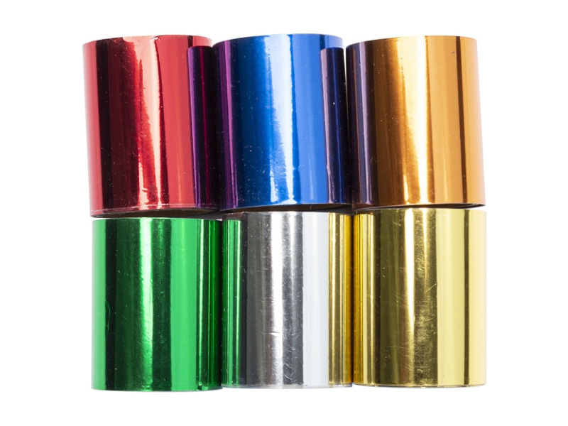 Fólie mají zlatou, stříbrnou, oranžovou, modrou, zelenou a červenou kovově lesklou barvu, každá má šířku 40 mm a délku 3 m.