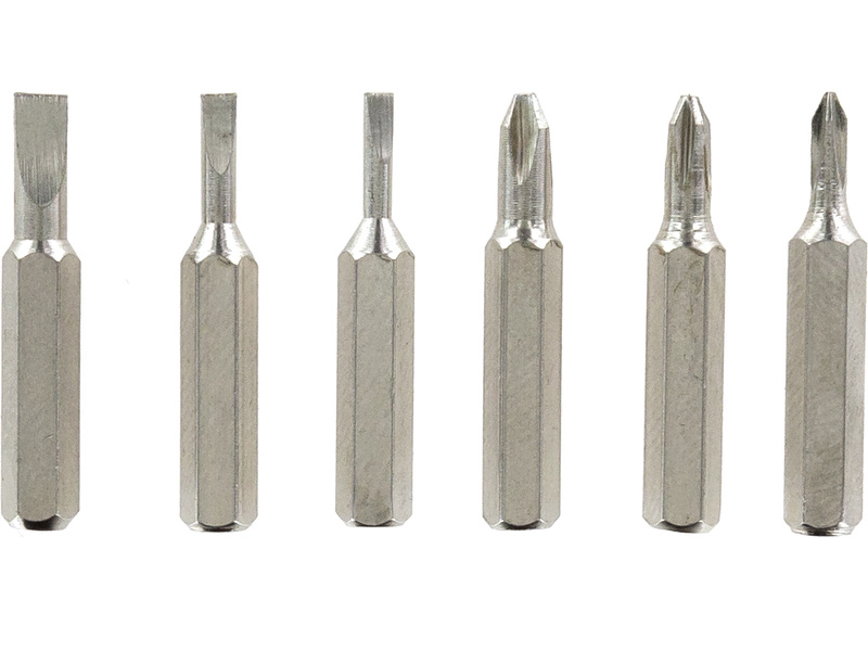 - Obsahuje bity: 3 křížové (PH000, PH00, PH0) a 3 ploché (1,5, 2 a 3 mm)