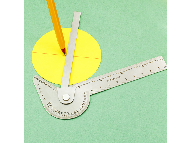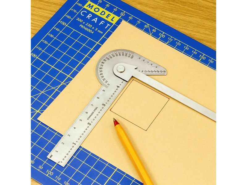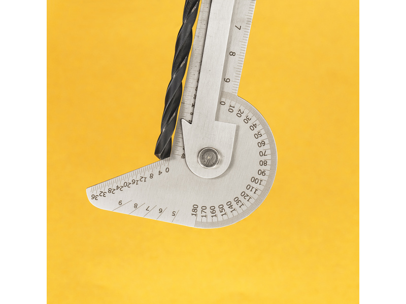 Modelcraft univerzální ocelový úhloměr 5-v-1 s měřítkem 100mm, měří přesně úhel, lze orýsovat střed kružnice, rozdělí kružnici do sektorů, polygonů a polygramů (až 9 stejných částí), změří správný vrcholový úhel břitu po nabroušení vrtáku. Lze použít pro rýsování i měření.