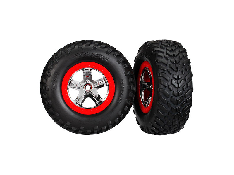 Kompletní zadní kola pro 2WD, přední i zadní pro 4WD auta Traxxas Slash. Chromované disky SCT s červenými ráfky s nalepenými pneumatikami SCT a vložkou (S1 super měkká směs).