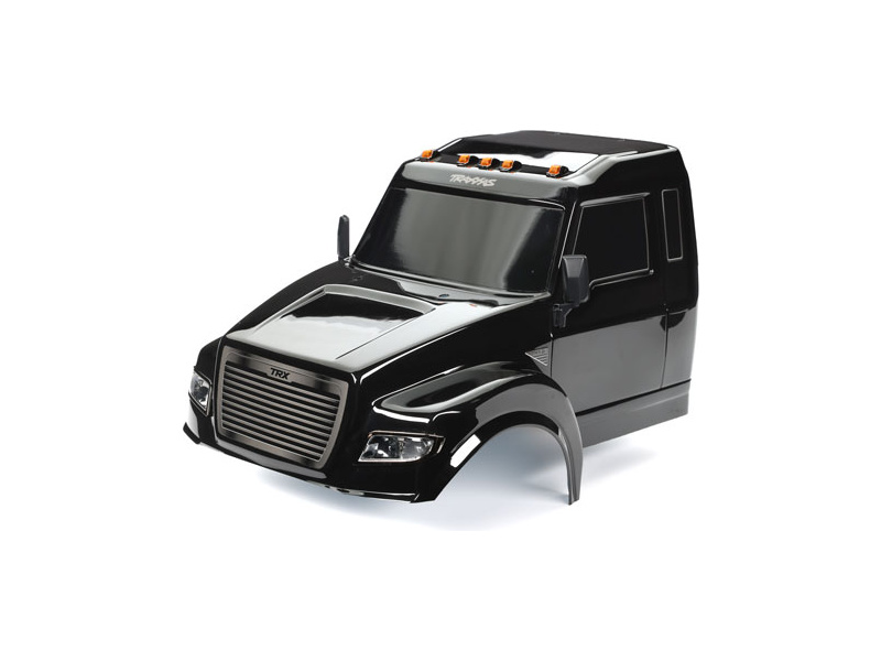 Traxxas karosérie TRX-6 Ultimate RC Hauler černá - nabarvená s aplikovanými polepy, včetně předních a střešních světel a bočních zrcátek.